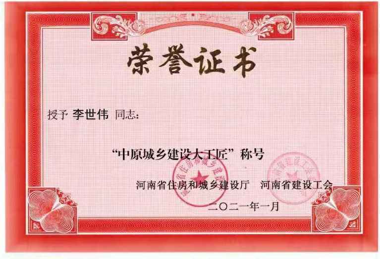 常州李灿文化艺术交流有限公司李世伟同志获“中原城乡建设大工匠”称号